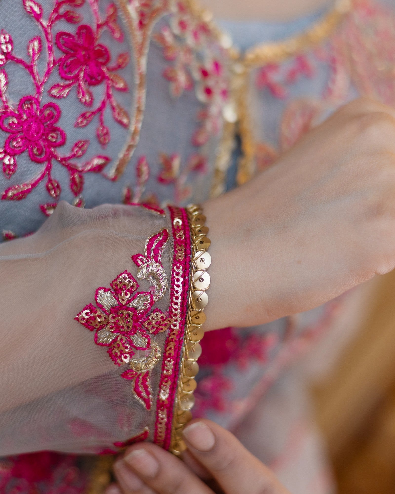 Gulbahar — a celebration of soft femininity and timeless artistry. Crafted from sheer organza with delicate thread, zari, and sequin work, this ensemble captures the essence of ethereal beauty. The silk inner and tissue silk skirt flow effortlessly, creating a silhouette that’s both regal and romantic.